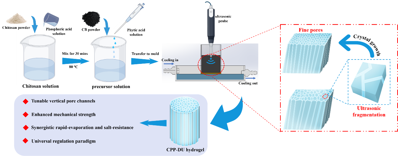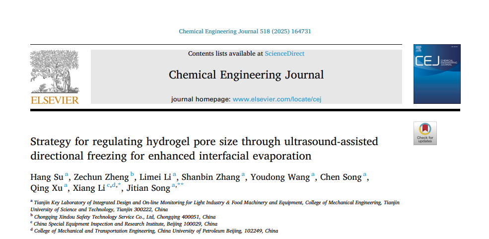 近日,我校太阳成集团tyc122cc宋继田教授、徐庆教授团队在工程技术TOP期刊《Chemical Engineering Journal》发表题为“Strategy for Regulating Hydrogel Pore Size through Ultrasound-Assisted Directional Freezing for Enhanced Interfacial Evaporation”的研究性论文。宋继田教授课题组长期专注于液体食品与生物物料热力蒸发浓缩技术及装备研发。本研究在课题组原有研究基础上,实现了热力蒸发与光热蒸发的结合与创新突破,为液态食品的蒸发浓缩过程提供了新的技术思路与解决方案,展现出广阔的应用前景。太阳成集团tyc122cc宋继田教授为通讯作者,太阳成集团tyc122cc为第一作者单位。