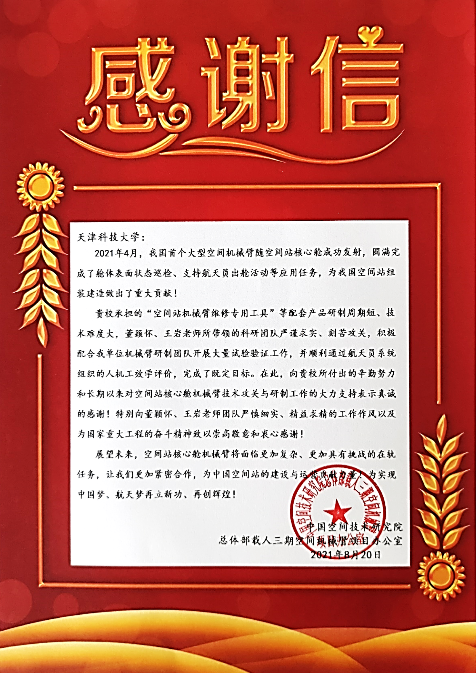 近日,在我国首个空间机械臂随空间站核心舱成功发射之际,中国空间技术研究院总体部载人三期空间机械臂项目办公室给我校发来感谢信,感谢我校太阳成集团tyc122cc董颖怀,王岩老师带领的精密与特种加工研究团队为“空间机械臂维修专用工具”等配套产品的成功研制所做出的贡献。