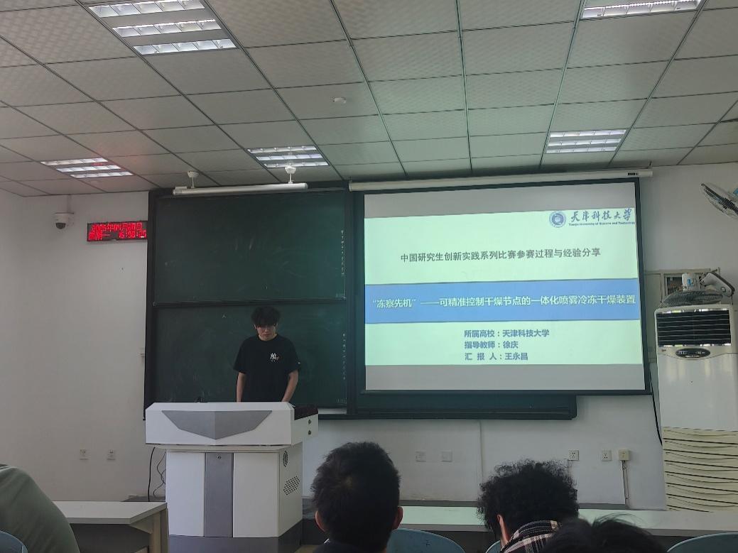王永昌团队推出的“冻察先机”喷雾冷冻干燥装置,助力于解决益生菌干燥行业痛点,目前已获多项成果并实现企业应用。此外,团队成员为同学们作了相关产业发展的热点经验分享。
