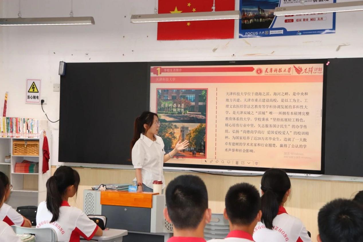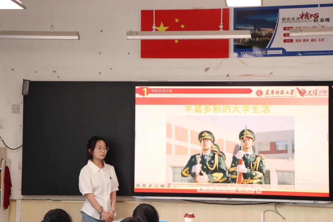 不仅如此,原莹欣同学还分享了丰富多彩的大学生活。她用自己的亲身经历,讲述了在社团活动中如何结交志同道合的朋友,如何通过团队协作完成一项又一项富有挑战性的任务,如何在志愿服务中走进大沽口炮台遗址博物馆,以讲解员身份为参观者讲述近代历史,在实践中感悟红色文化;在学术竞赛中,面对困难和压力时,如何坚持不懈、努力钻研,最终取得优异成绩。这些充满激情与奋斗的故事,让中学生们对未来的大学生活充满了向往和憧憬,也在他们心中种下了努力学习、追求梦想的种子 。