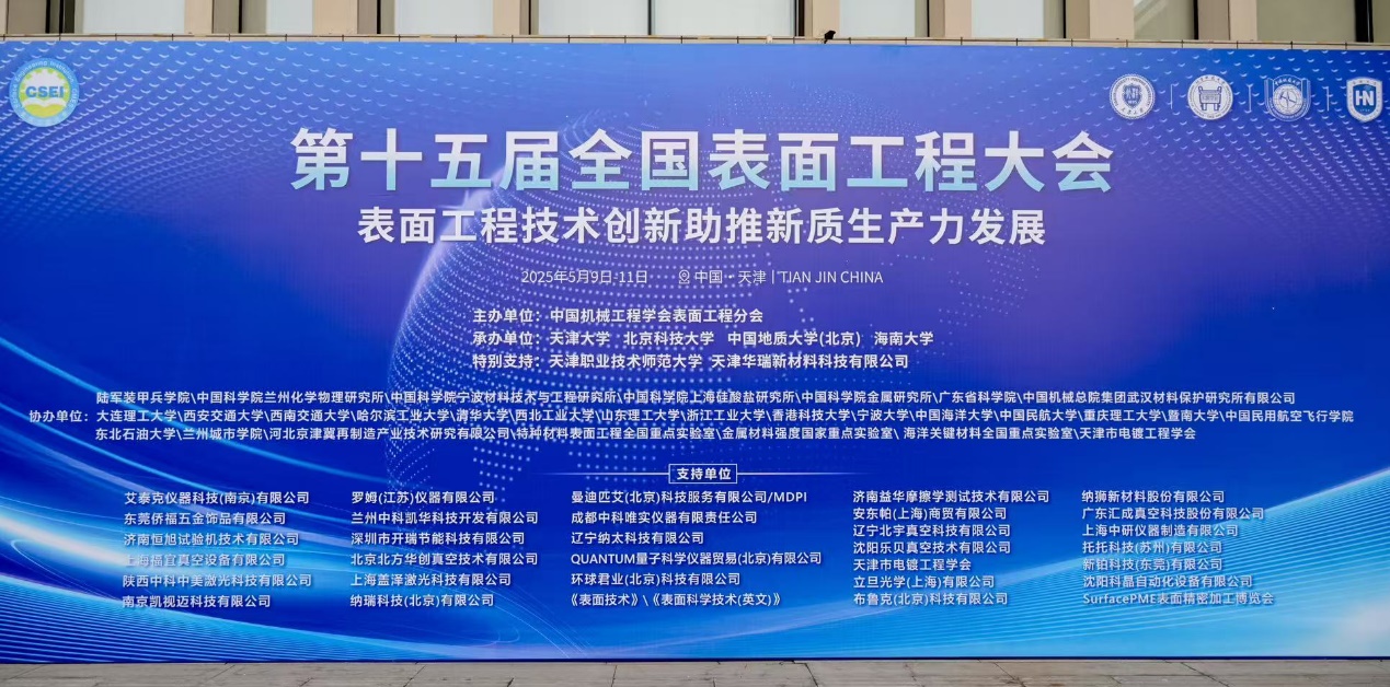 2025年5月9日至11日,第十五届全国表面工程大会在天津召开,会议由中国机械工程学会表面工程分会主办,天津大学、北京科技大学、中国地质大学(北京)和海南大学共同承办。